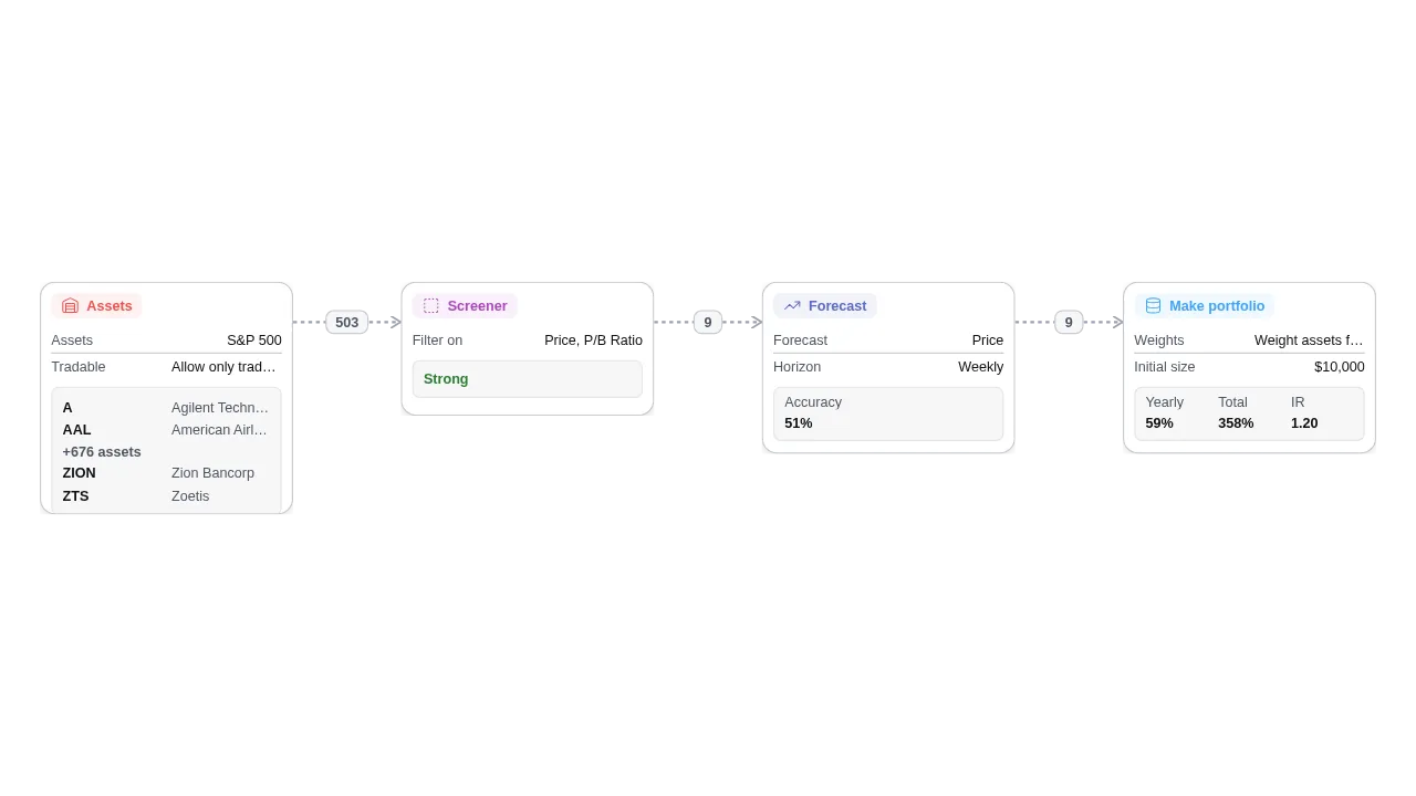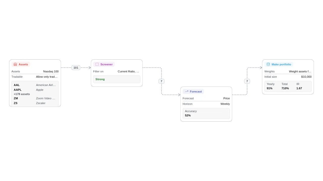 Design autonomous strategies by connecting purpose-built nodes. Each node performs a specific task, like screening assets, forecasting prices, constructing portfolios, or visualizing results. Allowing you to create sophisticated, AI-driven trading systems without writing code.