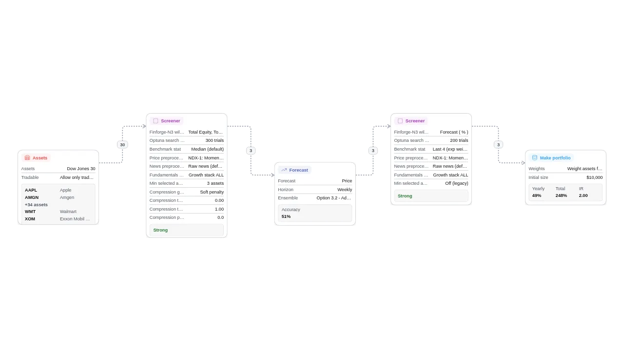 Chaining the nodes is meaningful because they solve different parts of the problem. The first Screener-N3 reduces noise by finding better candidates, Forecast-N3 adds timing by estimating near-term return potential, and the second Screener-N3 concentrates the signal by selecting the strongest forecasts before optimization and position sizing.