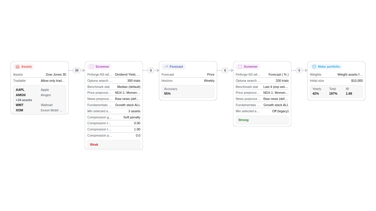 That makes node chaining meaningful: first screening reduces noise, forecasting adds timing, second screening enforces quality control, and portfolio construction turns all stages into actionable allocations.
