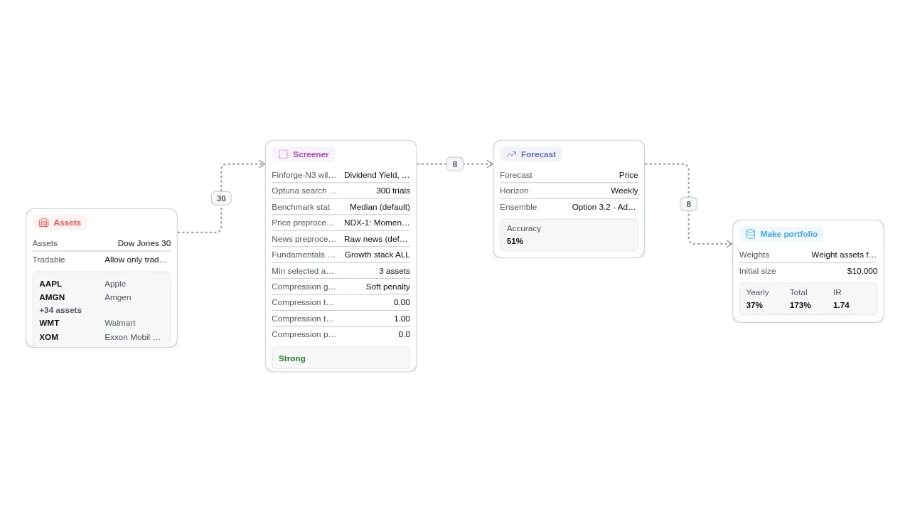 This Finforge-N3 AI model flow starts with the DIJA-30 as the asset universe, then chains together two AI model nodes: Screener-N3 and Forecast-N3.